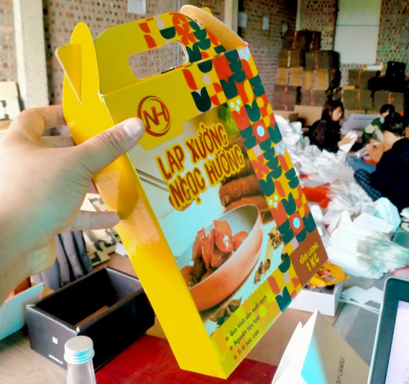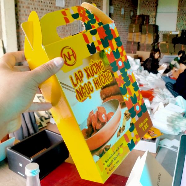 Hộp carton nắp gập có sỏ quai được thiết kế theo kiểu nắp gập liền thân (gấp từ 1 tấm carton, gập thành hộp chỉ bằng thao tác đơn giản, không cần keo), giúp đóng mở nhanh mà vẫn giữ form chắc chắn. Phía trên hộp có quai xách tiện dụng, giúp khách hàng dễ dàng mang theo mà không sợ tuột hay biến dạng hộp.